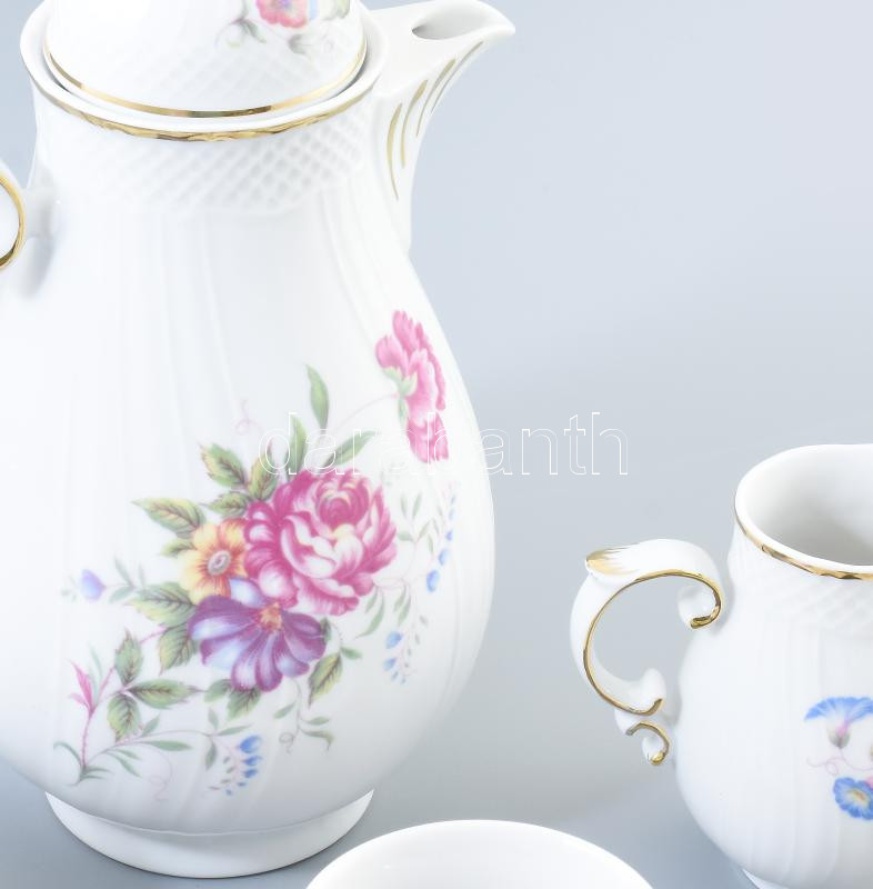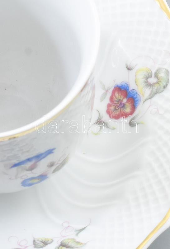 Leírás: Hollóházi virág mintás porcelán mokkás készlet. Matricás, jelzett, hibátlan hat személyes