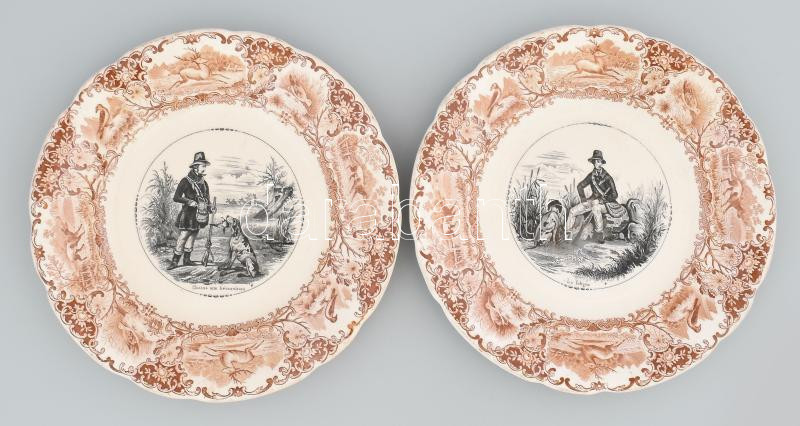 Leírás: Sarreguemines 2 darab vadászjelenetes dísztál. Jelzett, sérülésekkel, d: 20,5 cm