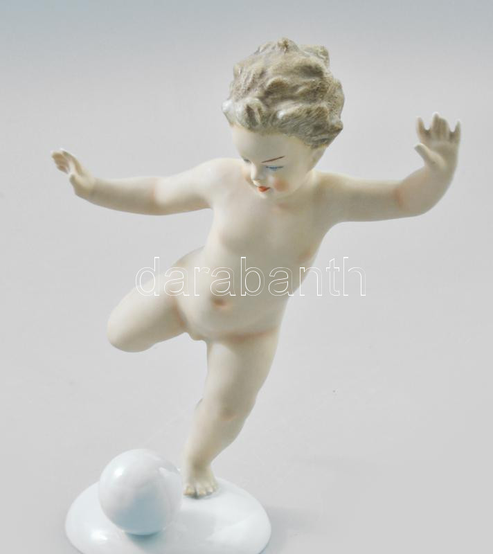 Leírás: Schaubach Kunst labdázó puttófigura. Mázas és biszkvit porcelán, jelzett, hibátlan, m: 17,5 cm