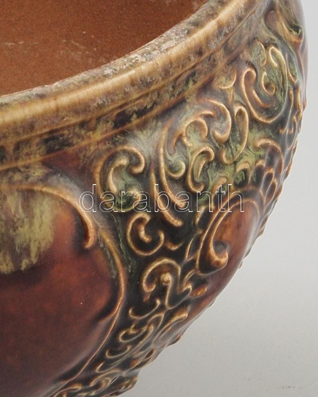 Leírás: Zsolnay "Elizabeth" kaspó. Mázas kőcserép, cca 1880, formaszám: 5493/3. Jelzett, minimális kopottsággal, d: 24 cm, m: 17,5 cm.