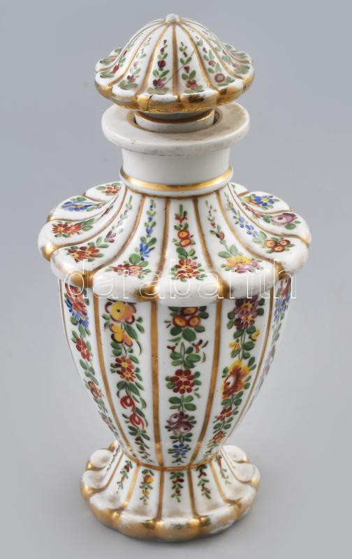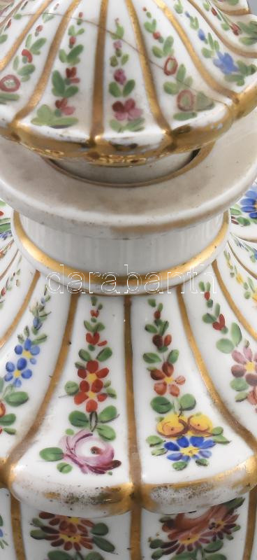 Leírás: cca 1860-1880, Biedermeier porcelán italos palack. Kézzel festett, kopással, dugóján repedéssel, jelzés nélkül, m: 19 cm