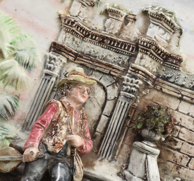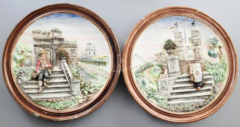 cca 1900, 2 darab majolika tál, plasztikus jelenetekkel. Javítással, hiánnyal, drótozva, d: 31,5 cm /// KIZÁRÓLAG SZEMÉLYES ÁTVÉTEL, NEM POSTÁZZUK! / ONLY PERSONAL COLLECTION AT OUR OFFICE!
