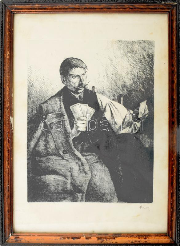 Leírás: Olvashatatlan jelzéssel: Kártyázó. Rézkarc, papír. Lap széle kissé foltos. Üvegezett, kissé sérült fakeretben. 25x19,5 cm