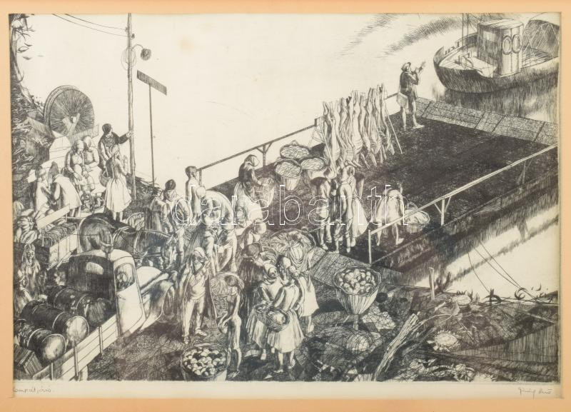 Leírás: Görög Rezső (1930- ?): Kompátjáró. Rézkarc, papír, jelzett. Dekoratív, üvegezett fakeretben, 26×38 cm