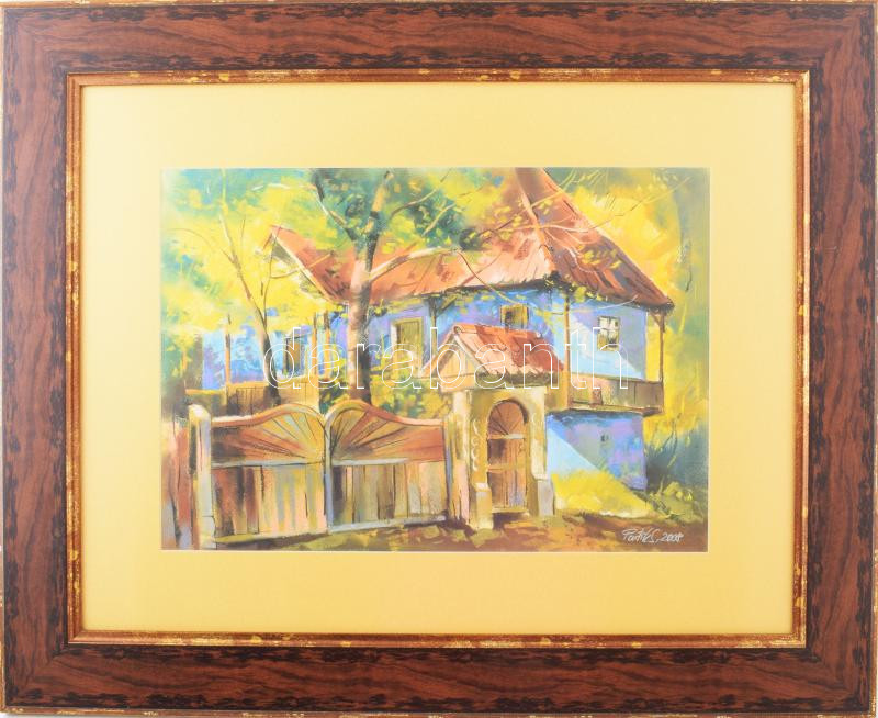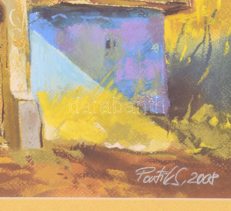 Leírás: Portik Sándor (1959-): Napfényes utcarészlet. Pasztell, papír. Jelezve jobbra lent. 34x49 cm. Üvegezett fakeretben.