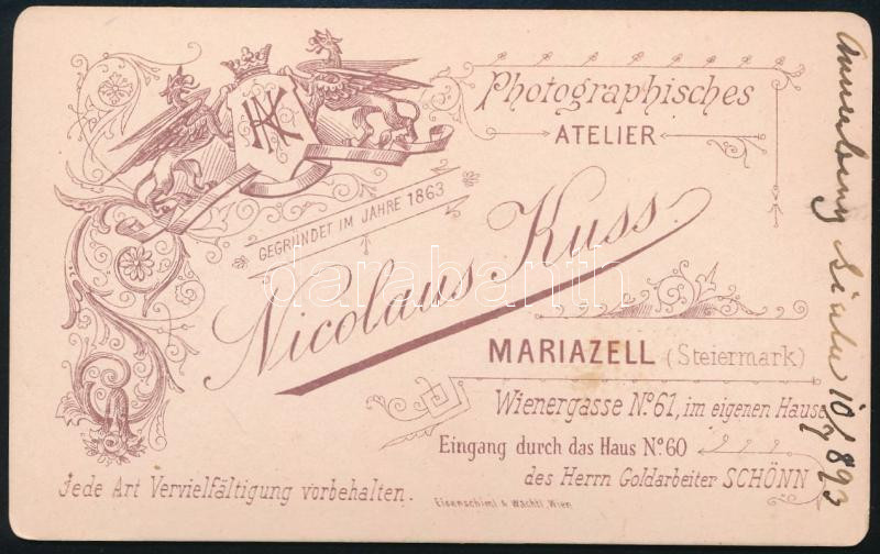 1893 Mariazell látképe, keményhátú fotó Nicolaus Kuss műterméből, 6,5×... https://www.darabanth.com/hu/467-Gyorsarveres/467.0/Fotomuveszet/Foto~500022/1893-Mariazell-latkepe-kemenyhatu-foto-Nicolaus-Kuss-mutermebol-6-5x10-5-cm~II3156627