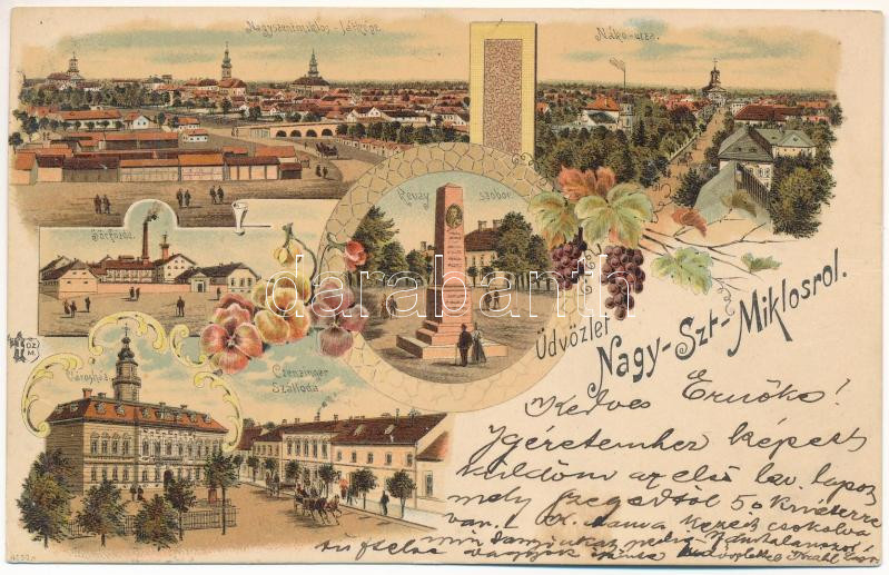 1898 (Vorläufer) Nagyszentmiklós, Sannicolau Mare; Náko utca, Sörfőzde, sörgyár, városháza, Czenzinger szálloda, Révay szobor / street, town hall, brewery, hotel, statue. O.Z.M. Art Nouveau, floral, litho