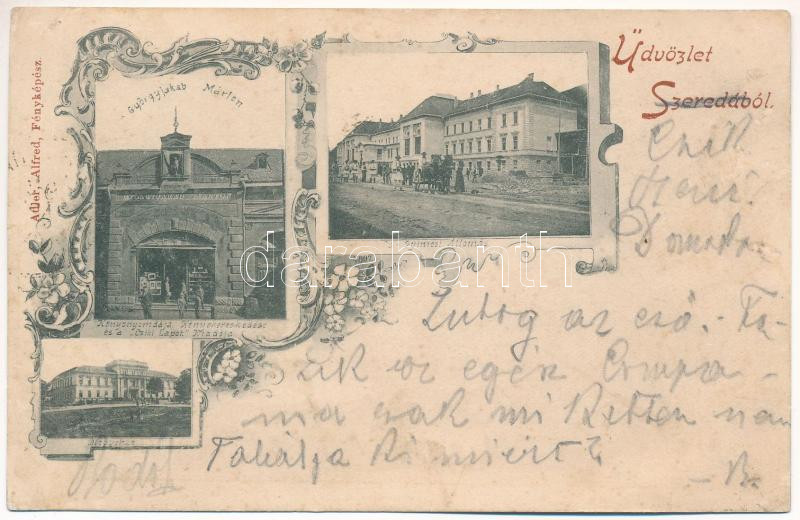 Leírás: 1899 (Vorläufer) Csíkszereda, Szereda, Mercurea Ciuc; Gyimesi vasútállomás, Megyeház, Györgyjakab Márton könyvnyomdája, könyvkereskedés üzlete és a "Csiki Lapok" kiadója. Adler Alfréd fényképész / Ghimes railway station, county hall, book and printing shop (r)