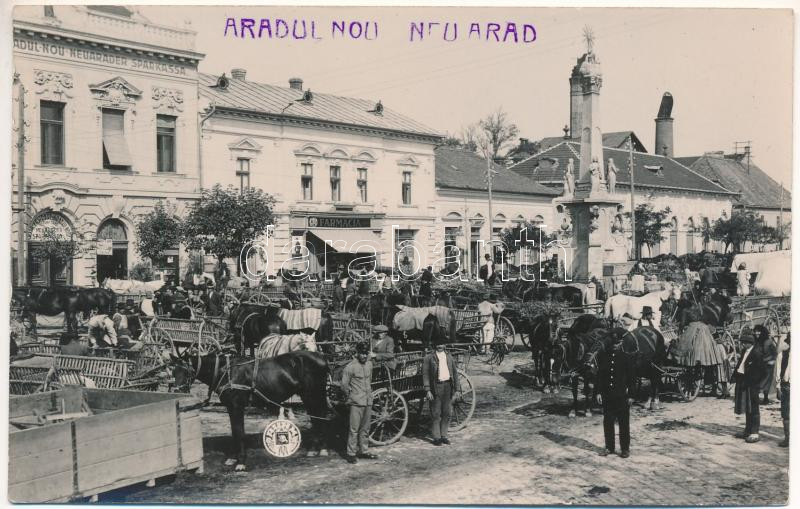 Leírás: Arad, Újarad, piac, Szentháromság szobor, takarékpénztár, Zsiga üzlete, gyógyszertár / Aradul Nou, shops, savings bank, market, pharmacy. photo