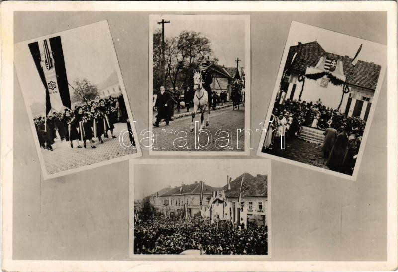 1938 Érsekújvár, Nové Zámky; bevonulás, Horthy Miklós fehér lovon, Mindent Vissza Érsekújvári Frontharcosok zászlóva. Hátoldalon kézzel rajzolt magyar zászlós keret / entry of the Hungarian troops, Regent Horthy + "1938 Érsekújvár visszatért" So. Stpl.