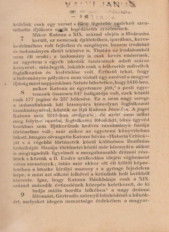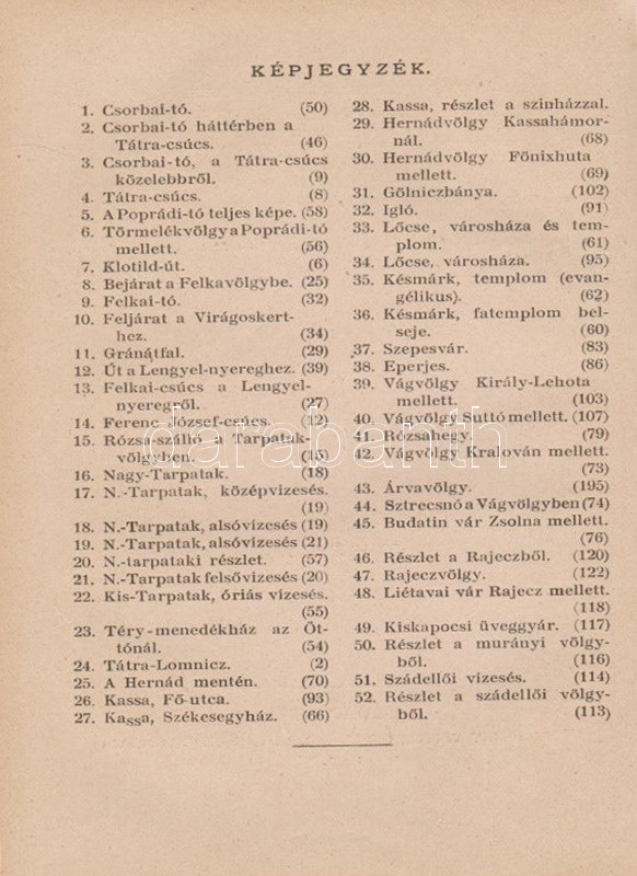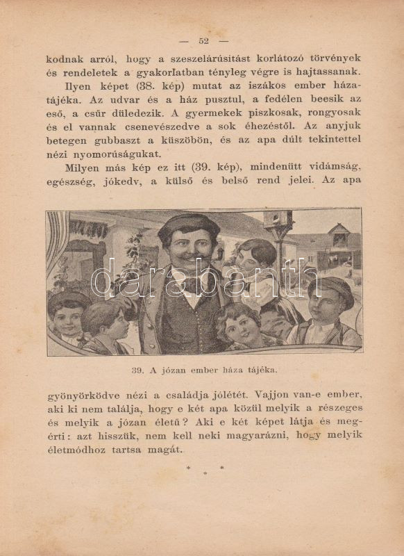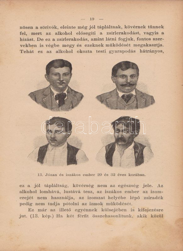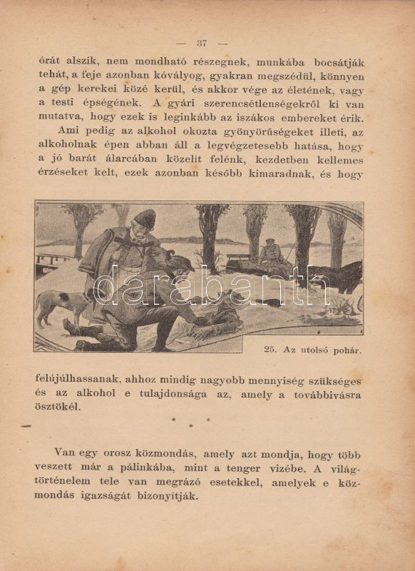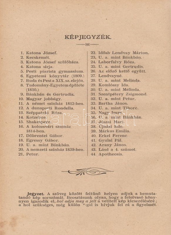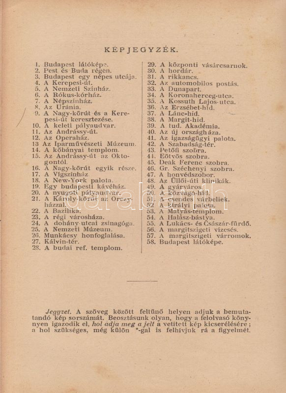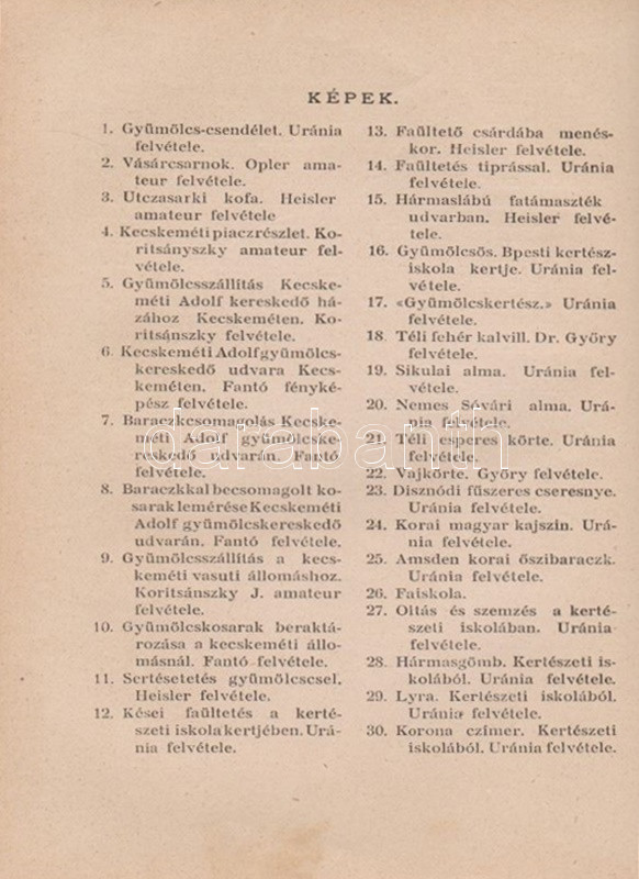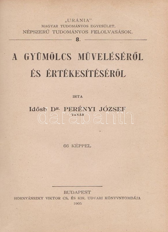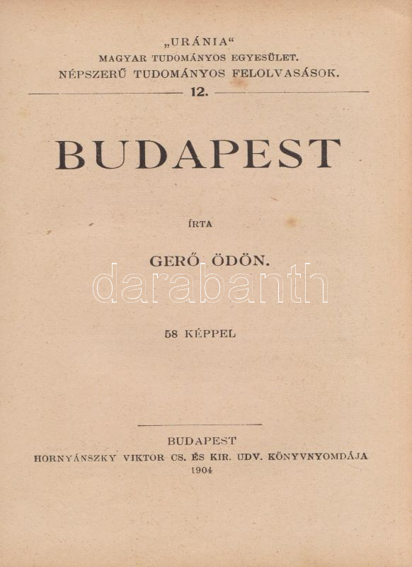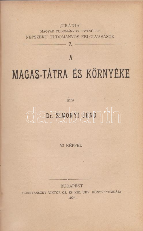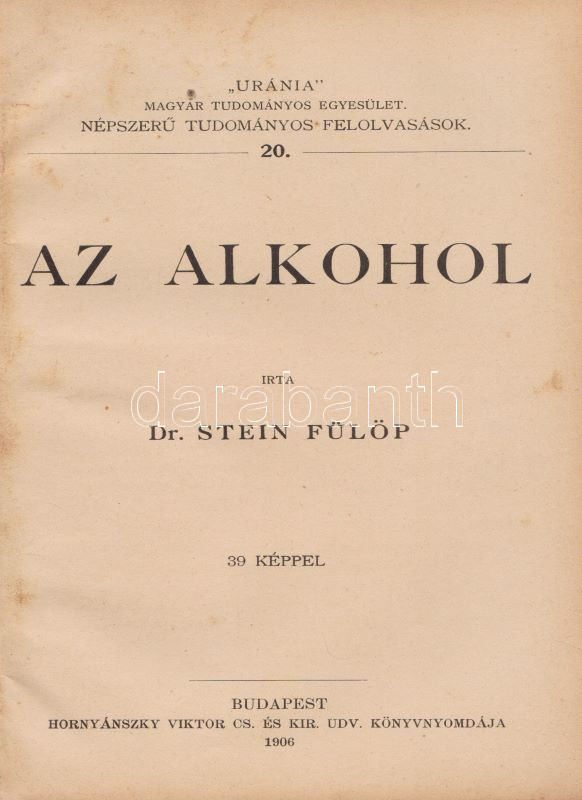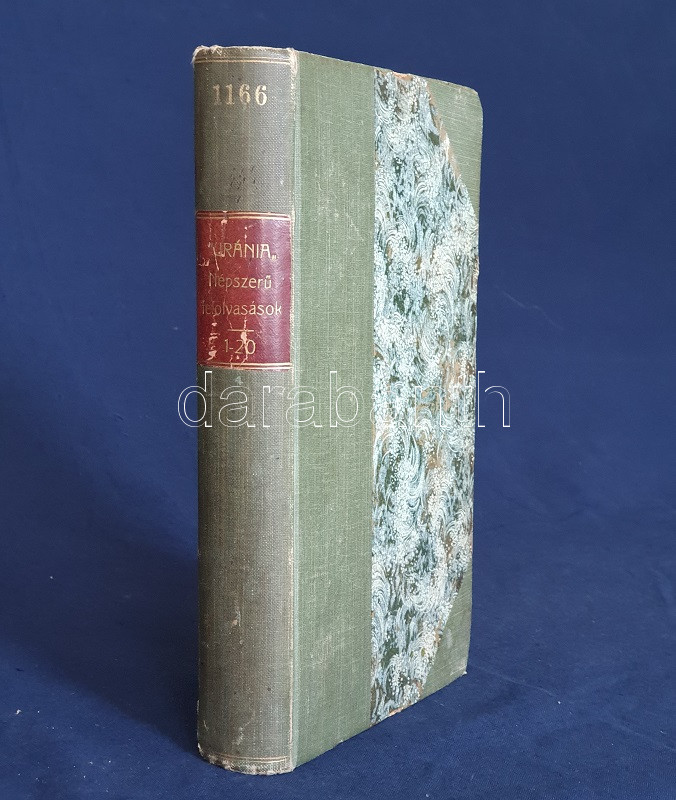 ,,Uránia" Magyar Tudományos Egyesület. Népszerű tudományos felolvasások. Molnár Viktor közreműködésével szerkesztik Klupathy Jenő és legifj. Szász Károly. 1-20. szám.[Egybekötve.] Budapest, 1904-1906. Hornyánszky Viktor ny. Az előadások terjedelme 24 és 55 oldal között változik. Az Uránia Magyar Tudományos Egyesület a századforduló népszerű ismeretterjesztő szervezete, mely egyfelől folyóirat-kiadással foglalkozott, másrészt hazafias szellemiségű ismeretterjesztő előadásokat szervezett. Az előadásokat - mint az gyűjteményünkből is kiderül - a legkülönbözőbb témákban tartották, a felolvasások során illusztráció gyanánt 30-50 képet vetítettek ki. A multimédiás előadás-sorozat egyben üzleti vállalkozás volt: az előadásszövegeket, a vetítő lámpát és a vetítendő képeket illő ár mellett bármely művelődésre vágyó közönség kikölcsönözhette. A gyűjteményünkben szereplő előadások: 1. [Gyulai Ágost?]: Madách életéből. 45 képpel. 2. Gyulai Ágost: Katona József élete. 44 képpel. 3. Gyulai Ágost: Zrinyi, a költő. 30 képpel. 4. Simonyi Jenő: Az Al-Duna. 44 képpel. 5. Mahler Ede: Babilon és a Biblia. 33 képpel. 6. Gyulai Ágost: Képek Vörösmarty életéből. 56 képpel. 7. Simonyi Jenő: A Magas-Tátra és környéke. 52 képpel. 8. idősb Perényi József: A gyümölcs műveléséről és értékesítéséről. 66 képpel. 9. Balázs Béla: Az Alpesekben és a Rajna völgyén. 70 képpel. 10. Müller Oszkár: Délnémet nagyvárosok. 62 képpel. 11. Halácsy Endre: Középeurópai nagyvárosok. 59 képpel. 12. Gerő Ödön: Budapest. 58 képpel. 13. Gyulai Ágost: Képek Shakespeare életéből. 50 képpel. 14. Fürst Károly: A fogak ápolása és gyógyítása. 32 képpel. 15. Farkas Kálmán: Az állattenyésztés. 51 képpel. 16. Farkas Kálmán: Háziállataink egészségéről. 39 képpel. 17. Putnoky Miklós: Pompeji és a római élet. 46 képpel. 18. Orosz Endre: Az ősember élete. 46 képpel. 19. Juba Adolf: A tüdővész. 59 képpel. 20. Stein Fülöp: Az alkohol. 39 képpel. Az utolsó előadás szövegében - a téma súlyossága miatt és az elrettentés kedvéért - a szövegen belül is elhelyezték a kísérő illusztrációkat. Példányunk első előadásának címoldala hiányzik, törzsszövege hiánytalan. Az első nyomtatott oldalon, illetve a 2. előadás 5. oldalán régi tulajdonosi bélyegzés, illetve bejegyzés. Néhány oldal enyhén foltos. Poss.: Vályi János lakitelki okleveles közgazda és szőlőbirtokos. Korabeli félvászon kötésben, az aranyozott címfelirat a gerincen bordó címkén. Jó példány.