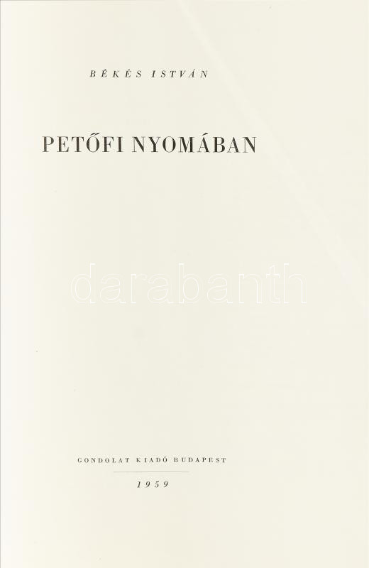 Békés István: Petőfi nyomában. Bp., 1959, Gondolat Kiadó. 528 p. Számos képpel illusztrált. Kiadói egészvászon kötés, kissé foltos borítóval, laza kötéssel, címlapon apró javított szakadással, néhány lapon ceruzás jelülésekkel és jegyzetekkel, néhány kevés lapon lapszéli folttal.