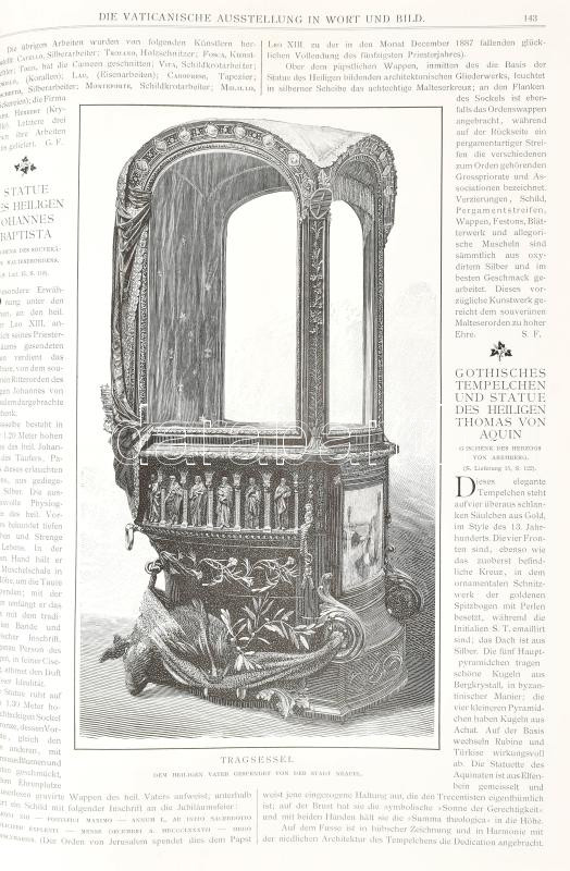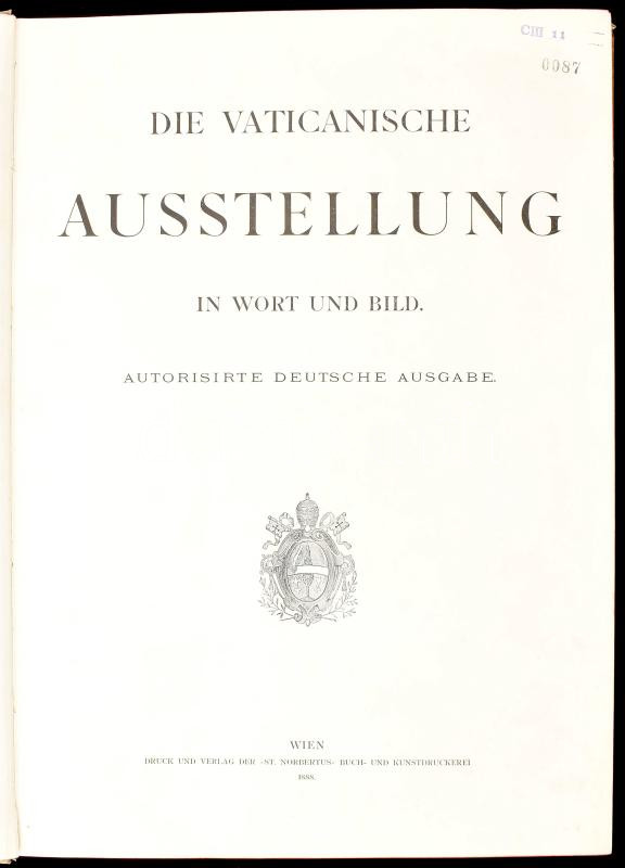 Die vaticanische Ausstellung in Wort und Bild. Wien, 1888, Druck und Verlag der St. Norbertus Buch- und Kunstdruckerei. Kiadói festett, aranyozott egészvászon kötés, színezett lapélek, gerinc sérült, kopottas állapotban.