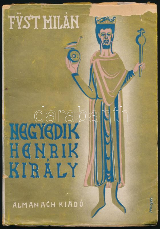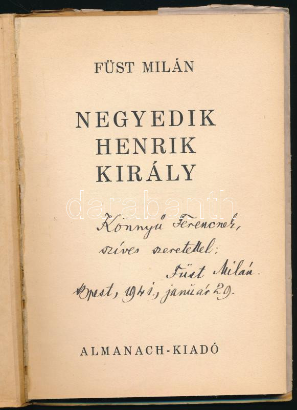 Füst Milán: Negyedik Henrik király. A szerző, Füst Milán (1888-1967) író, költő által DEDIKÁLT példány! [Bp.,1940], Almanach-Kiadó, 67+1 p. Első kiadás! A borító Mayer Árpád munkája. Kiadói papírkötésben, kissé hiányos kiadói papír védőborítóban.