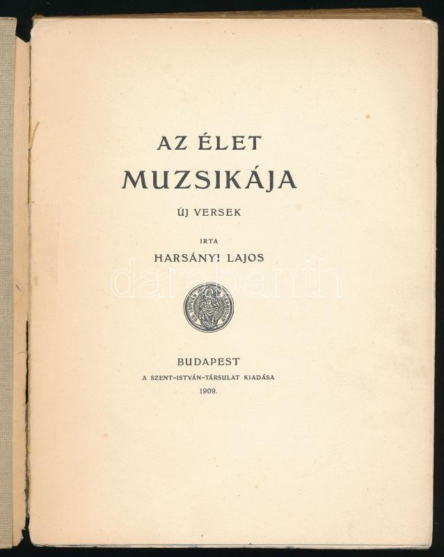 Harsányi Lajos: Az élet muzsikája. Új versek. Bp., 1909, Szent István-Társulat, 116 p. Első kiadás. Kiadói papírkötés, sérült, a gerincnél ragasztott borítóval.
