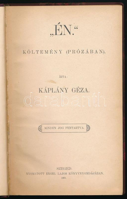 Káplány Géza: ,,Én". Költemény (prózában). Szeged, 1901, szerzői kiadás (Engel Lajos-ny.), 113+(3) p. Egyetlen kiadás. Átkötött félvászon-kötésben, kissé sérült borítóval, néhány kisebb lapszéli sérüléssel. Ritka!