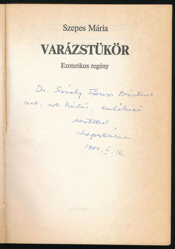 Szepes Mária: Varázstükör. Ezoterikus regény. A szerző, Orsi Szepes Mária (1908-2007) által Dr. Sávely főorvos részére DEDIKÁLT példány. Bp.,1989, Göncöl Kiadó. Kiadói papírkötés.