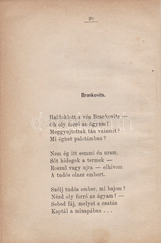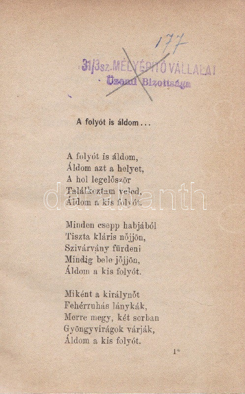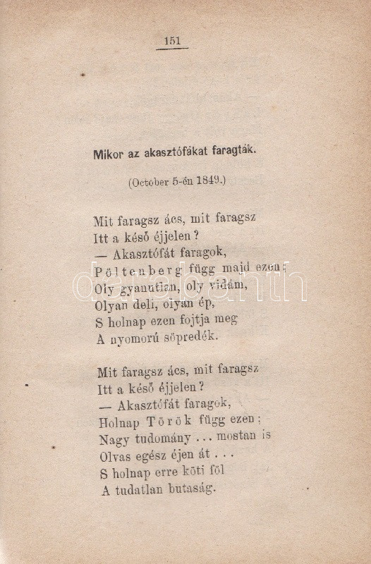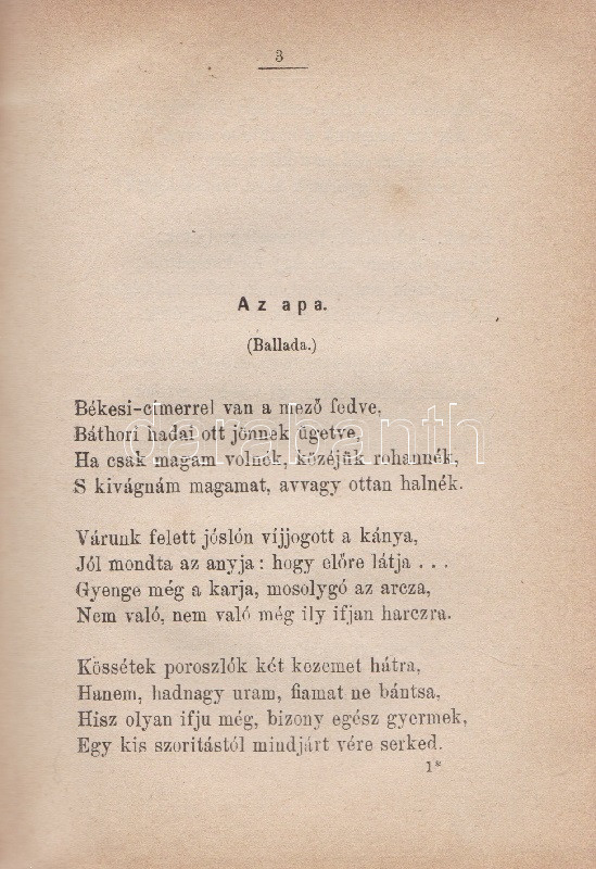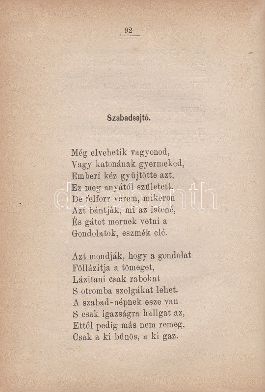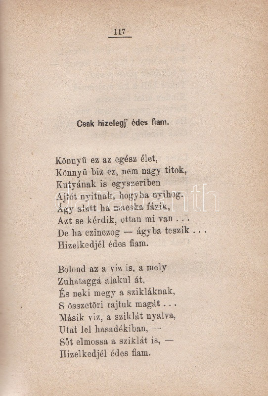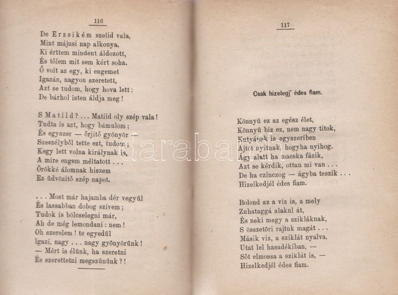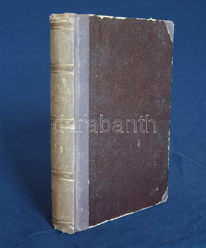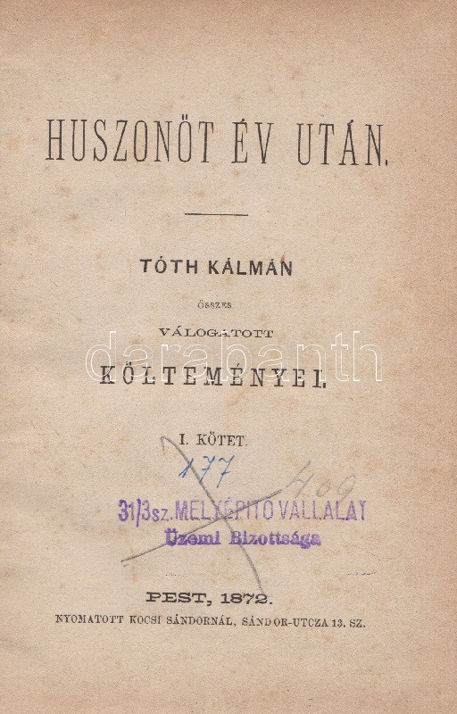 Tóth Kálmán: Huszonöt év után. Tóth Kálmán összes válogatott költeményei I-II. kötet. [Teljes, egybekötve.] Pest, 1872. Nyomatott Kocsi Sándornál. 160 p.; 176 p. Egyetlen kiadás. Tóth Kálmán (1831-1881) költő, újságíró, szerkesztő, drámaíró, később Baja város országgyűlési képviselője. A költői pályáján 1847-ben induló költő a szabadságharc leverése után - számos költőtársától eltérően - nem vonult önkéntes száműzetésbe, hanem a főváros népszerű periodikájához, Nagy Ignác ,,Hölgyfutár" című lapjához csatlakozott, balladáival, szerelmes verseivel, illetve Kipfelhauser álnéven írt szatirikus költeményeivel az 1850-es évek népszerű költői közé tartozott. 1860-ban ,,Bolond Miska" címen megalapította a kor vezető élclapját, néhány évvel később pedig ,,Fővárosi Lapok" címen a kuriózumnak számító szépirodalmi napilapot. Az első előzéken, az első kötet címoldalán, annak verzóján és a belív néhány oldalán régi gyűjteményi bélyegzés. Szüry 0. Poss.: 31/33. számú Mélyépítő Vállalat Üzemi Bizottsága. Aranyozott gerincű korabeli félvászon kötésben, márványmintás festésű lapszélekkel.