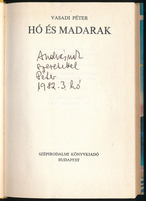 Vasadi Péter: Hó és madarak. (DEDIKÁLT). Bp., 1982, Szépirodalmi Könyvkiadó. Kiadói egészvászon-kötés, kiadói papír védőborítóban, kissé dohos. A szerző, Vasadi Péter (1926-2017) Kossuth- és József Attila-díjas költő, író, műfordító által DEDIKÁLT példány.