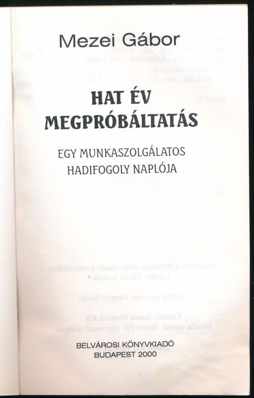 Mezei Gábor: Hat év megpróbáltatás. Egy munkaszolgálatos hadifogoly naplója. Bp., 2000, Belvárosi Könyvkiadó. Kiadói papírkötés, a borító sarkán ázásnyommal.