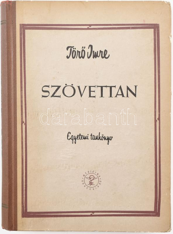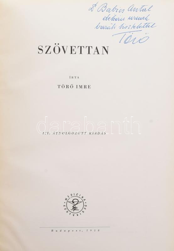Törő Imre: Szövettan. (DEDIKÁLT). Bp., 1958, Medicina. Számos fekete-fehér és színes illusztrációval. Kiadói félvászon-kötés. Megjelent 4600 példányban. A szerző, Törő Imre (1900-1993) orvos, hisztológus által Dr. Babics Antal (1902-1992) Kossuth-díjas orvos, urológus, sebész, az 1956. októberi Nagy Imre-kormány egészségügyi minisztere részére DEDIKÁLT példány