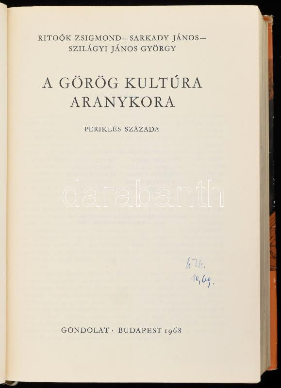 Ritoók Zsigmond-Sarkady János-Szilágyi János György: A görög kultúra aranykora. Homérostól Nagy Sándorig. Bp.,1968, Gondolat. Első kiadás. Fekete-fehér szövegközti képanyaggal illusztrált. Kiadói egészvászon-kötés, szakadt kiadói papír védőborítóban.