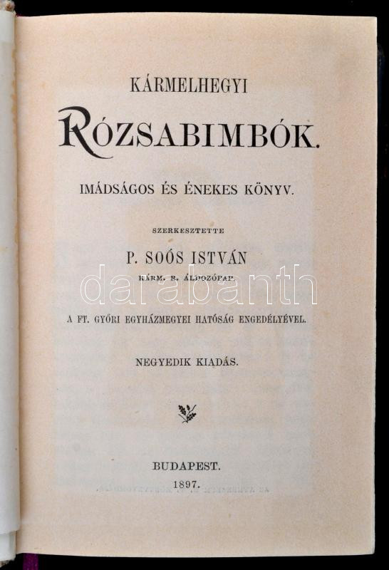 P. Soós István(szerk.): Kármelhegyi Rózsabimbók. Imádságos és énekes könyv. Bp., 1897, Athenaeum. Kiadói bársony kötés, réz kapocssal dobozban, jó állapotban.