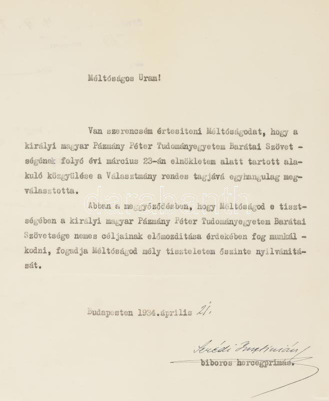 Leírás: 1934 Bp., Serédi Jusztinián (1884-1945) bíboros saját kézzel aláírt levele