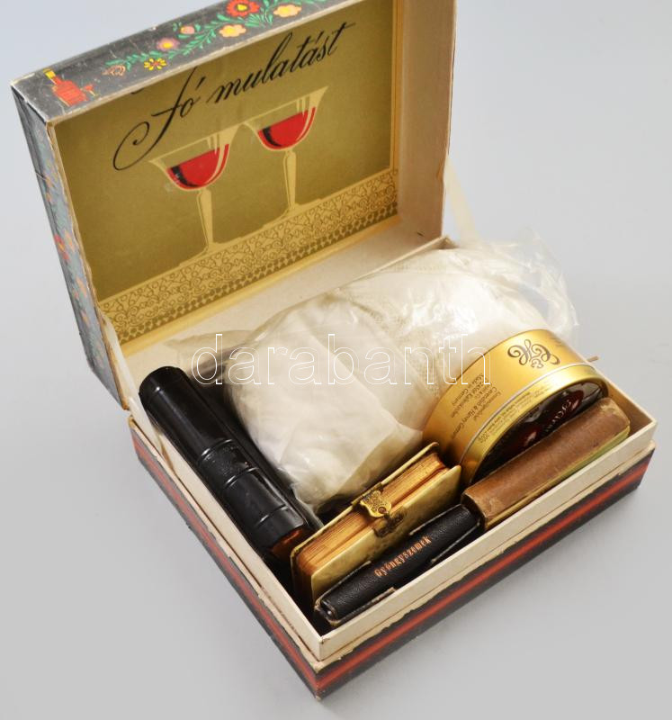 Leírás: Doboznyi kegytárgy: füzér, könyv, terítő, medálok, stb.