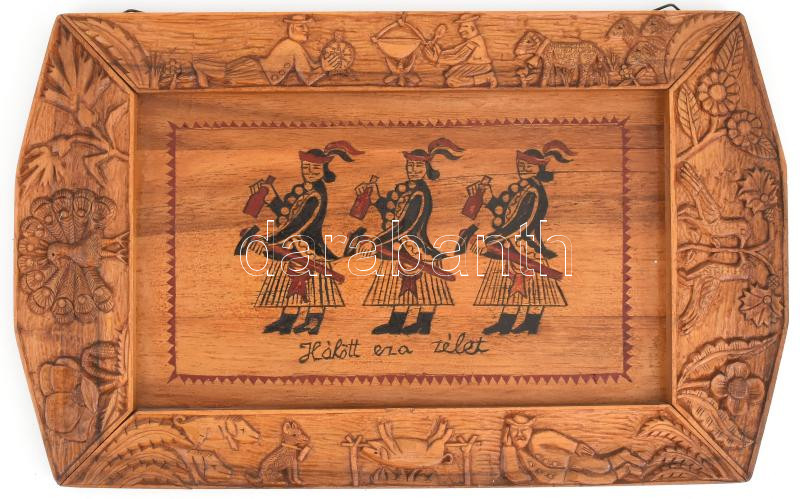 Leírás: Régi faragott tálca. "Hálött ez a zélet" felirattal, iszogató betyárok mintával, pereménél gazdag faragott mintával, 39x24 cm