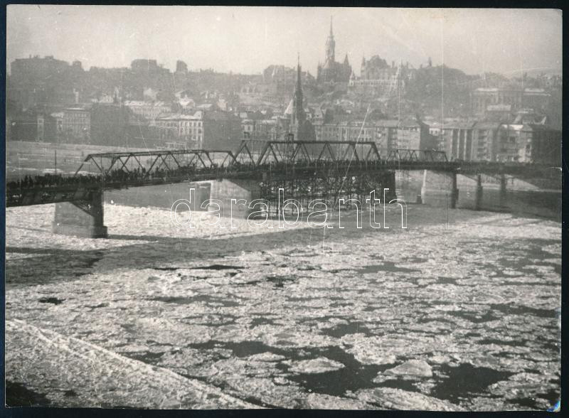 Leírás: Budapest, a Kossuth-híd jégzajláskor, sajtófotó, utólagos előhívás, sérülésekkel (szakadás, törésnyom, folt), 13,5×18 cm