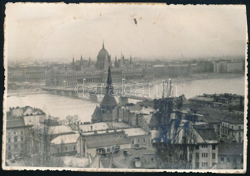 Leírás: cca 1946 Budapest, Kossuth híd, Parlament látképe, fotó sérülésekkel, hátoldalán ragasztásnyomokkal, 11,5×16,5 cm