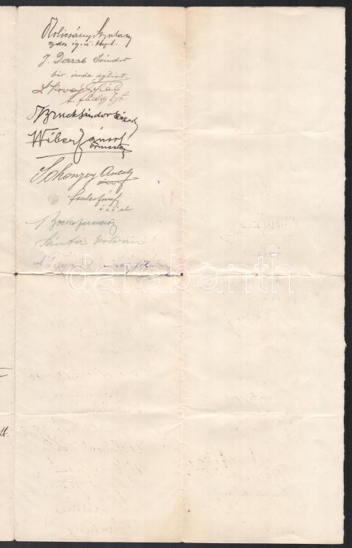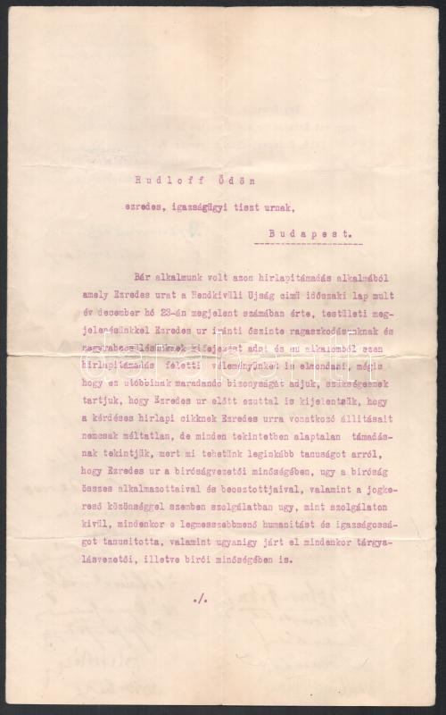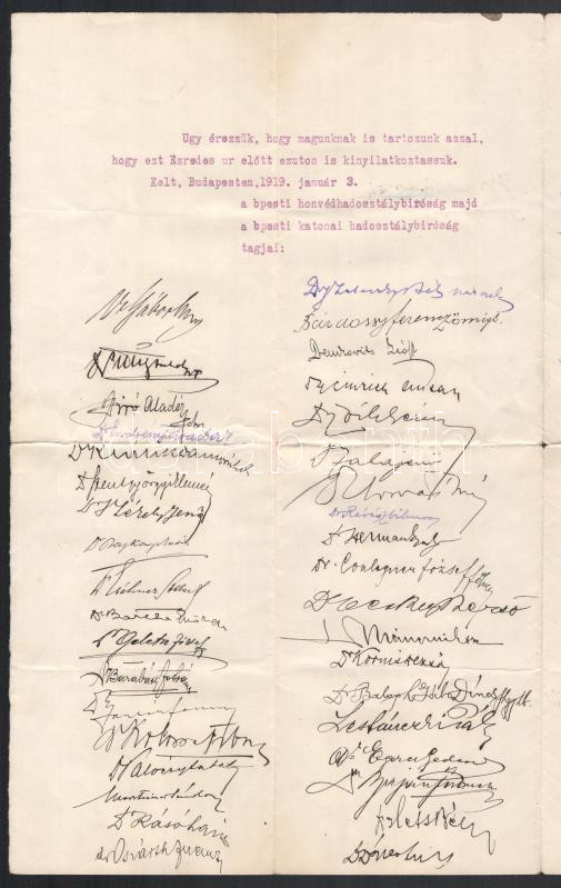 Leírás: 1919 Bp., Kinyilatkoztatás Rudolf Ödön ezredes részére, a budapesti honvéd hadosztály bíróság tagjainak aláírásával