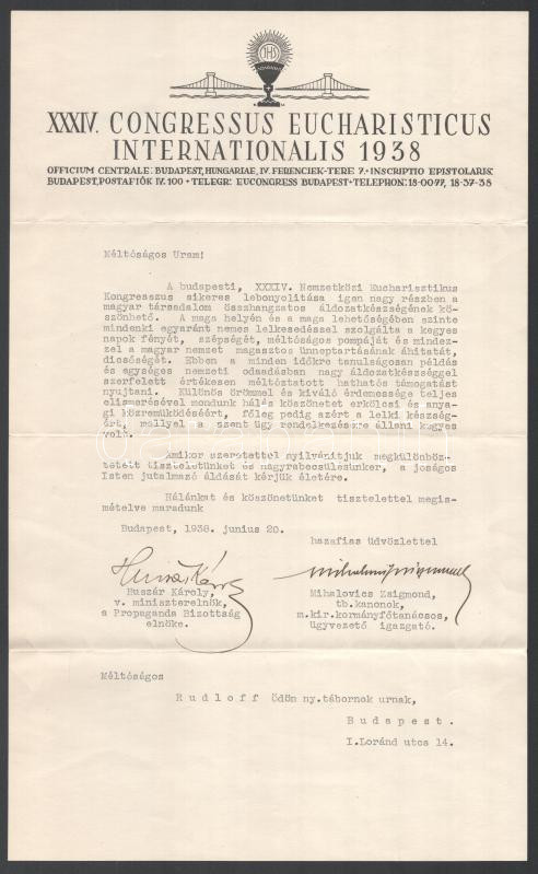 Leírás: 1938 Köszönet Rudolf Ödön nyugdíjas tábornoknak Huszár Károly volt miniszterelnök és Mihalovics Zsigmond aláírásával