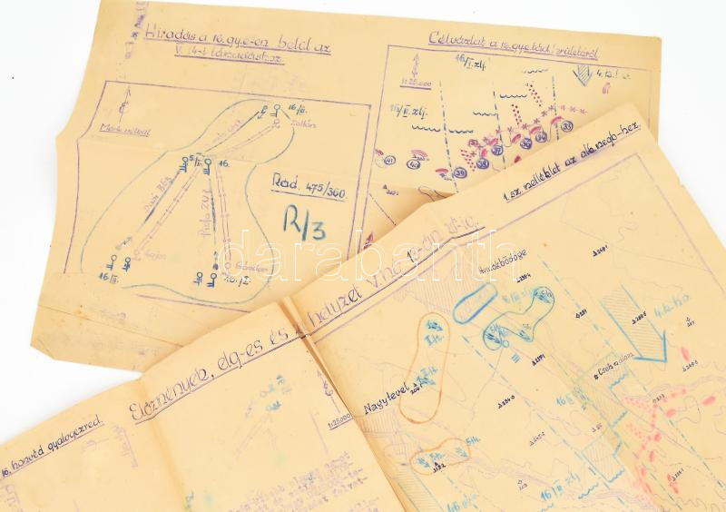 Leírás: Hadijáték dokumentumai, "Ezred alkalmazó megbeszélés 1943. május hó 14-én (terepen), M. kir. 16. honvéd gyalogezred", össz. 5 db