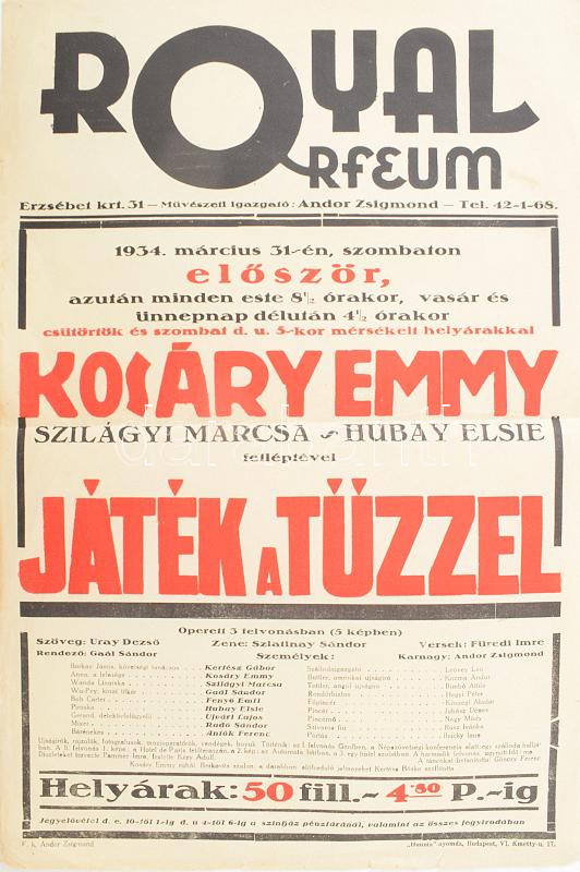 Leírás: 1934 Royal Orfeum műsoros plakátja, Kosáry Emmy nevével, hajtott, szakadásokkal, 47,5×31,5 cm