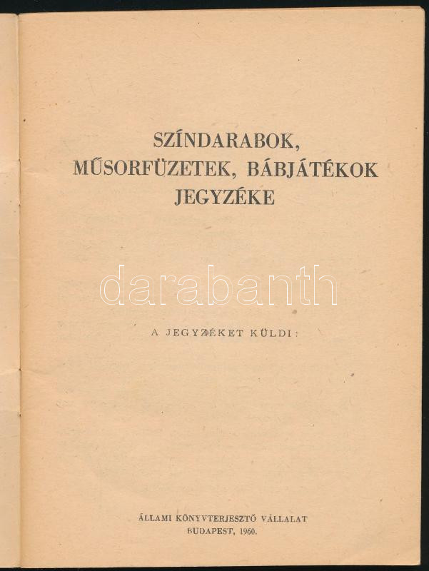 1960 Színdarabok, műsorfüzetek, bábjátékok jegyzéke, 73p https://www.darabanth.com/hu/467-Gyorsarveres/467.0/Mutargy-papirregiseg-egyeb/Nyomtatvanyok~2000102/1960-Szindarabok-musorfuzetek-babjatekok-jegyzeke-73p~II3153649