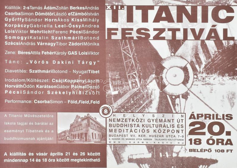 XII. Titanic Fesztivál. Kiállítók: 2-s Tamás, Ádám Zoltán, Berkes András, Csorba Simon, Dömötör László, efZámbó István, Győrffy Sándor stb.. Plakát, papír, jelzés nélkül, 42x59,5 cm. Lap alján apró szakadásokkal.