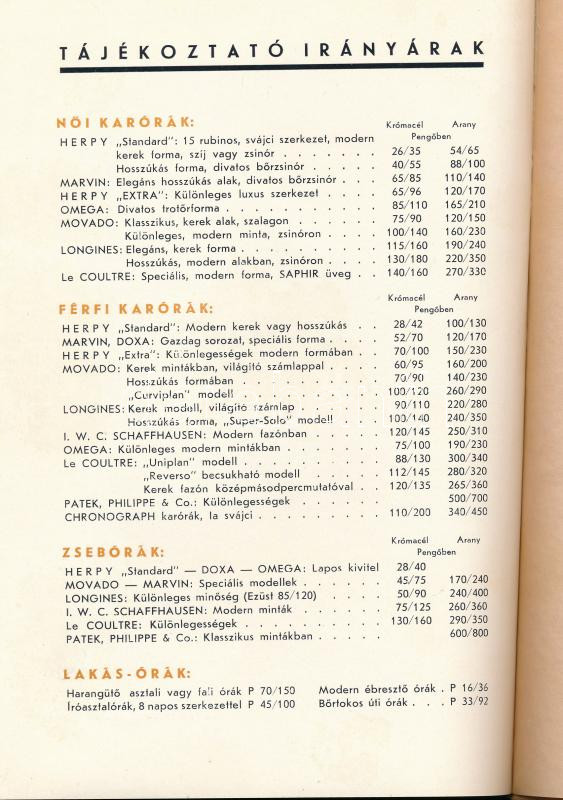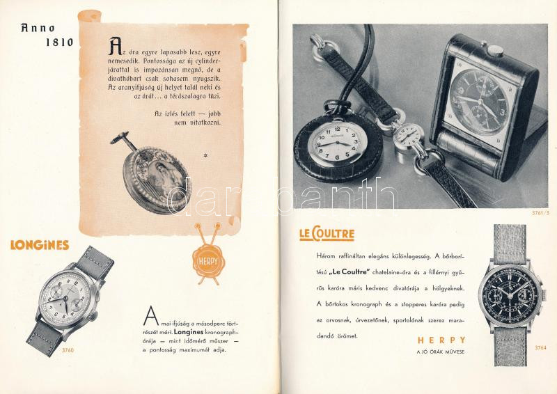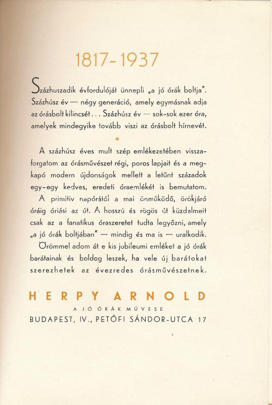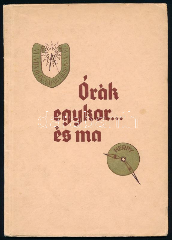 1936 ,,Órák egykor és ma." A jó órák boltja fennállásának 120. évfordulójára 1817-1937. Herpy Arnold áruminta katalógus, reklámkiadvány. Benne fekete-fehér fotókkal. Bp., 1936., Pápai Ernő, 16 sztl. lev. Rövid óratörténet mellett Movado, Le Coultre, Longines, Atmos órákkal, fekete-fehér fotókkal, a legvégén árakkal. Kiadói papírkötés, jó állapotban.