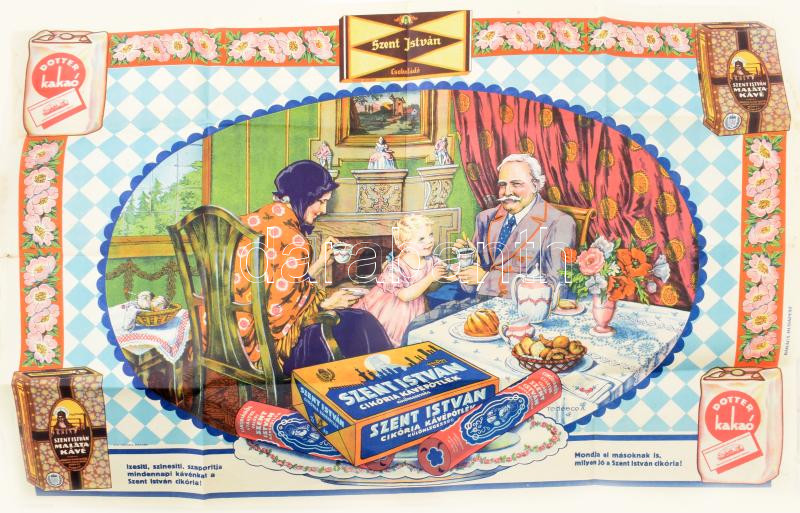Leírás: Szent István Cikóriakávé, Kakaó és Csokoládé reklámplakátja, hajtott, szakadásokkal, 60×92 cm
