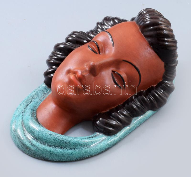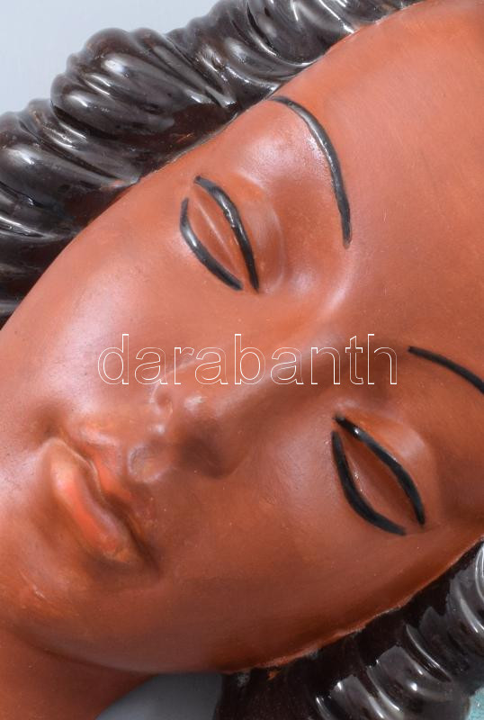 Leírás: Art deco kerámia női fej. Festett, jelzés nélkül, kis kopással, 23x15 cm