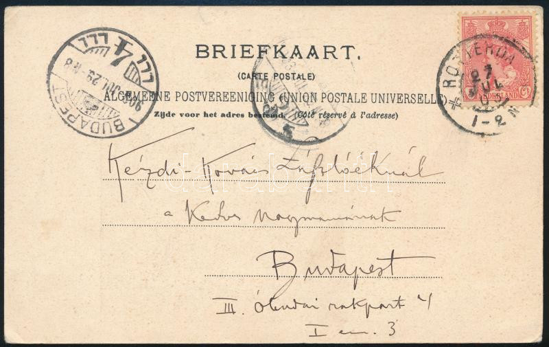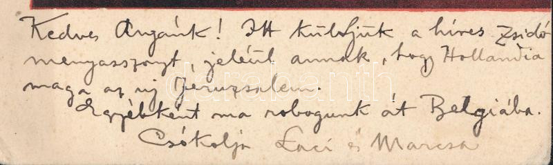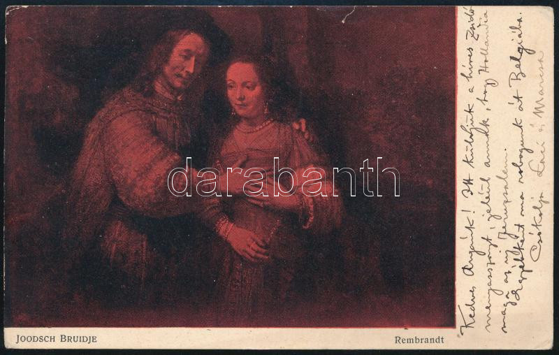 1903 Kézdi-Kovács László festőművész, műkritikus autográf sorai, édesanyjának Rotterdamból küldött, Rembrandt Zsidó menyasszony (Joodsch Bruidje) festményét reprodukáló képeslapon: "Itt küldjük a híres zsidó menyasszonyt, jeléül annak, hogy Hollandia maga az uj Jeruzsalem (...)"