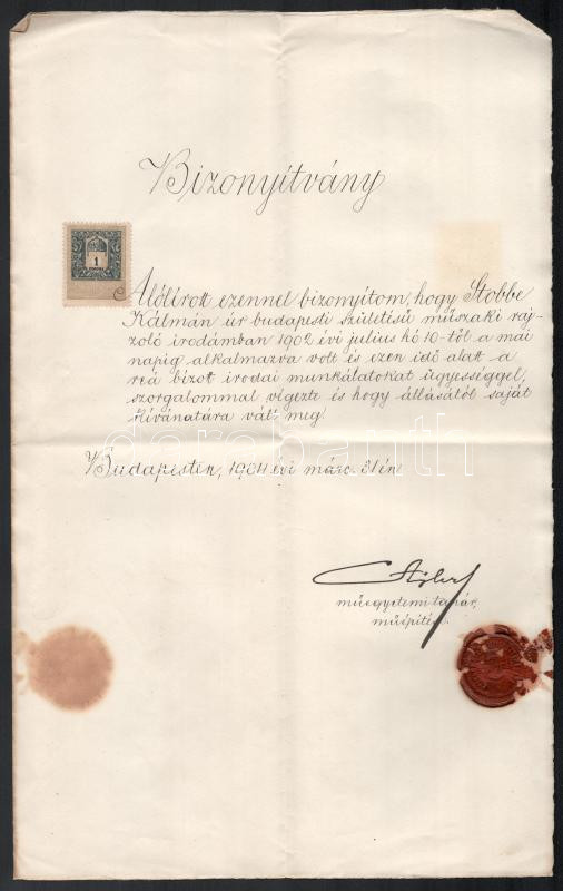 Leírás: 1904 Czigler Győző (1850-1905) építész (Saxlehner - palota, Hold utcai vásárcsarnok, Gozsdu-udvar), műegyetemi tanár munkáltatói bizonyítványa Stobbe Kálmán (1883-1936) építőmester részére, Bp., 1904. márc. 31., autográf aláírásával, töredezett pecsétjével, 1 K. okmányélyeggel.