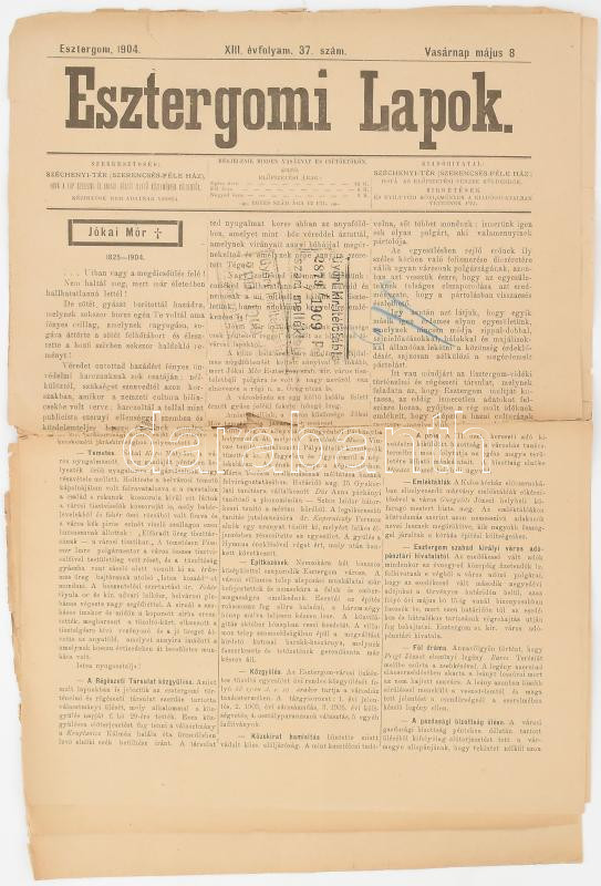 Leírás: 1904 Esztergom, Esztergomi Lapok XIII. évfolyam 37. száma, címlapon Jókai Mór haláláról szóló cikkel, széteső állapotban