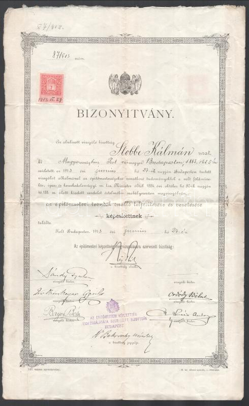 1913 Stobbe Kálmán (1883-1936) építőmester részére szóló építőmesteri bizonyítvány, Bp., 1913. jún. 27, rajta Ney Béla (1843-1920) építész, művészettörténész, Sándy Gyula (1868-1953) építészmérnök, műegyetemi tanár, Kolbenheyer Gyula (1851-1918) építész, festőművész, és Ordódy Béla (1856-?) mérnök, m. királyi állami felső építő ipariskolai tanár és mások aláírásaival, 2 K. okmánybélyeggel.