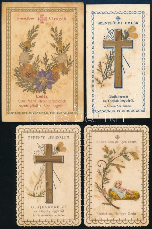 Leírás: cca 1910-1930 4 db Szentföldi emlék, virágokkal, a virágok sérültek, hiányosak, foltosak, 11x7 cm és 9x6 cm közötti méretben.