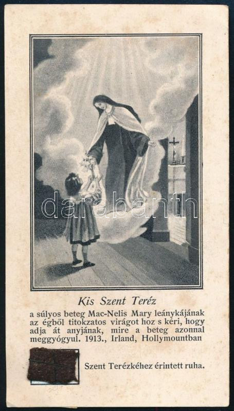 Leírás: cca 1913 Kis Szent Teréz, szentkép, Bp., Pallas-ny., "Szent Terézkéhez érintett" ruhaereklye darabbal, 11x6 cm