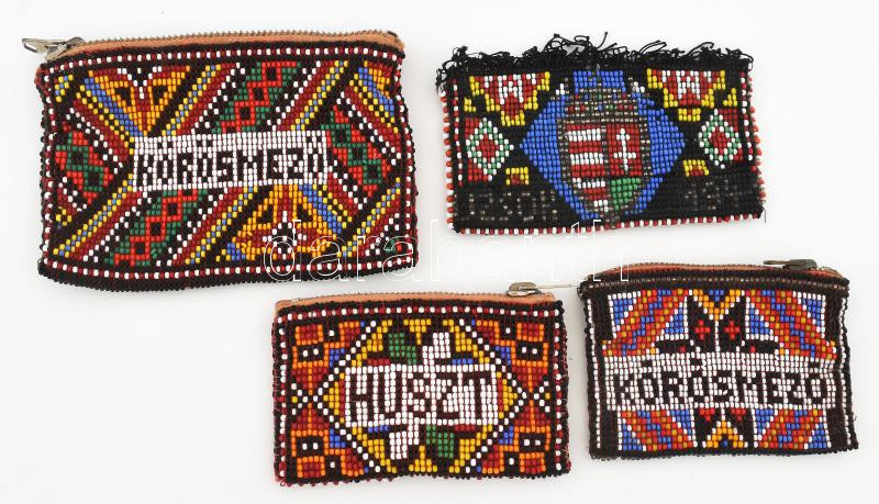 Leírás: cca 1940, 4 darab gyöngyfűzött erszény a Magyarországhoz visszacsatolt területek emlékére, városnevekkel, hiánnyal, 11x9 cm alatt