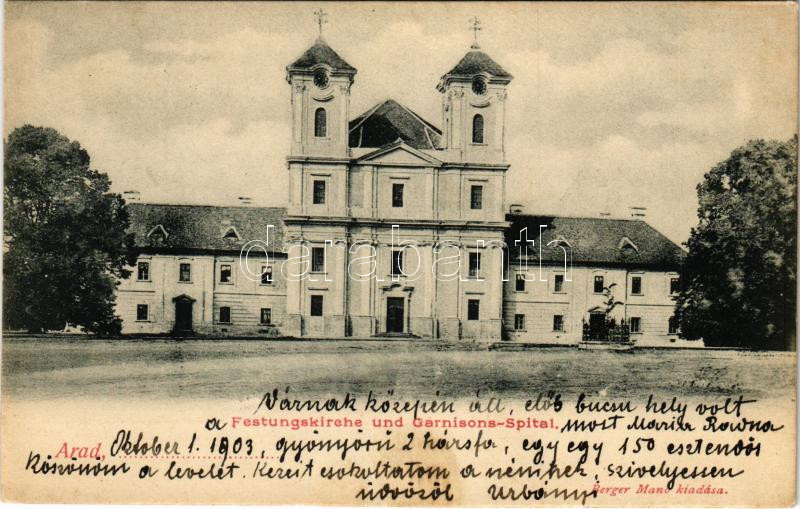 1903 Arad, Festungskirche und Garnisons-Spital / Vártemplom és helyőrs... https://www.darabanth.com/hu/468-Gyorsarveres/468.0/Kepeslapok/Erdely~2000006/1903-Arad-Festungskirche-und-Garnisons-Spital-Vartemplom-es-helyorsegi-korhaz-Berger-Mano~II3164040