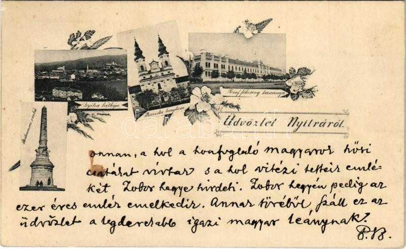 Leírás: 1900 Nyitra, Nitra; Piarista templom, József főherceg kaszárnya, Milleniumi emlék / church, military barrack, monument. Art Nouveau, floral